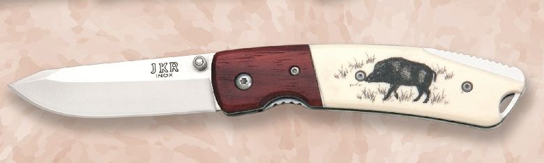 COLTELLO TASCABILE CON MANICO BIANCO DECORATO CINGHIALE TESTINA INOX LAMA 7,5 CM – JKR368