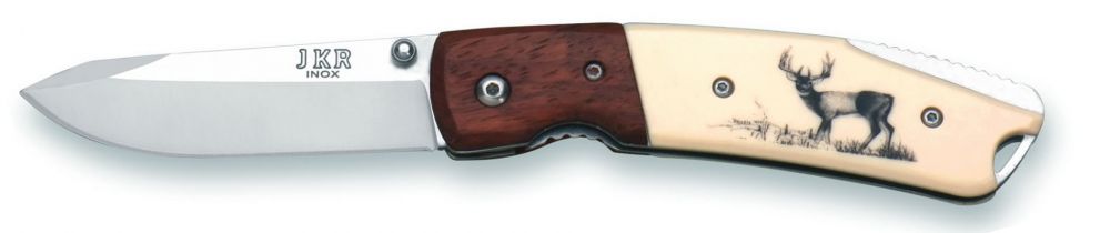 COLTELLO TASCABILE CON MANICO BIANCO DECORATO CERVO E FOGLIA TESTINA INOX LAMA 7,5 CM – JKR335